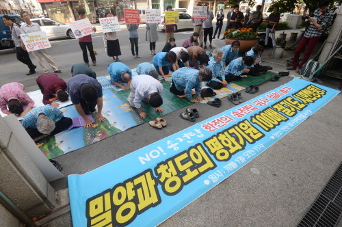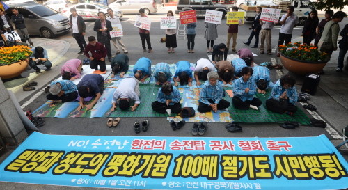 지난 5월 말 중단됐던 밀양 송전탑 건설 공사를 한전이 재개하겠다고 발표하자 청도 할머니와 환경단체 등은 1일 오전 대구 중구 한전 대경개발지사 정문 앞에서 송전탑 공사 재개 철회를 촉구하며 밀양과 청도의 평화기원 100배 절기도를 열었다.