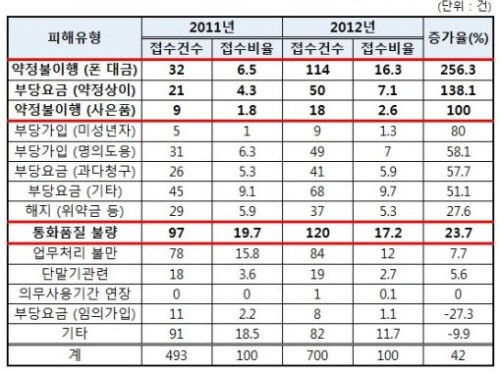 특히 ‘약정불이행’의 경우 가입 시 체결했던 요금 혹은 사은품이 약정 내용과 상이해 이의를 제기한 것으로 해당 피해건수는 2011년 대비 138.1%와 100%가 각각 증가했다.