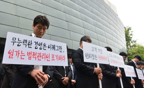 8일 오후 서울 성북구 성북동 현재현 동양그룹 회장 자택 앞에서 동양증권 노동조합 회원들이 현회장의 사죄와 보상을 요구하는 내용의 피켓을 들고 시위를 벌였다.