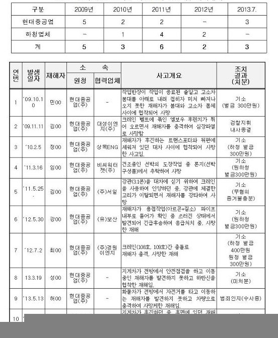 또 현대중공업에서는 올 상반기까지 기본 안전조치 부재로 인한 산재 사망사고가 3건 발생했다.