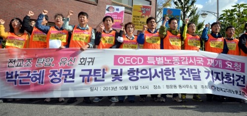 이런 가운데 전교조는 11일 오후 서울 종로구 궁정동 청운효자동 주민센터에서 '전교조 탄압, 유신회귀 박근혜 정권 규탄 기자회견'을 열고 "교육민주화를 위해 노력해 왔던 전교조에게 정부가 사실상 해산을 요구하고 있다"며 현 정부를 성토했다.