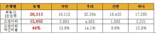 또한 농협은행의 부동산PF대출 연체율은 올해 7월말 현재 17.24%로 은행권에서 가장 높았다. 시중은행의 경우 국민은행 10.18%, 신한은행 6.10%, 우리은행 4.31% 등으로 대부분 10% 이내 수준에 그쳤다.