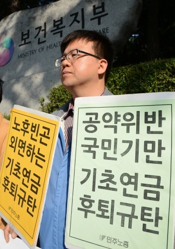 | ▲ 지난 14일 보건복지부 앞에서 열린 '기초연금공약이행촉구 기자회견'에서 국민연금 바로세우기 국민행동은 "국민의 노후불안을 조장하는 기초연금안 철회와 모든 노인에게 차별없이 기초연금 20만원을 지급하라"고 주장하며 피켓 시위를 벌였다. @Newsis | ||