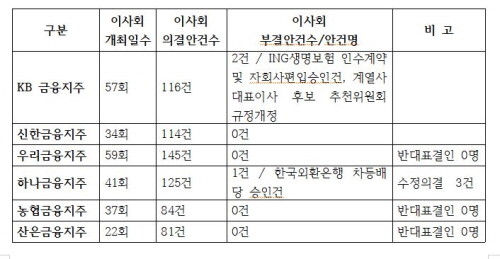 국회 정무위원회 소속 송호창 의원(무소속, 의왕·과천)이 금융감독원으로부터 제출받은 ‘금융지주사외이사회 현황자료’(2010~)에 따르면 2010년부터 현재까지 총 665건의 이사회 안건을 의결하면서 부결건수가 단 3건에 불과한 것으로 드러났다.