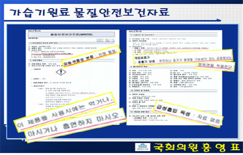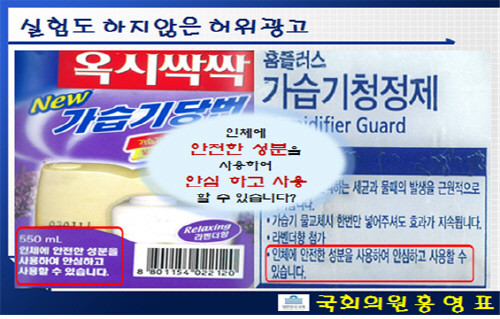 홍 의원은 “한국과 같이 보편적인 가습기살균제를 사용하는 나라는 한국 뿐”이라면서 “문제가 ‘옥시싹싹 NEW 가습기당번’에 대해 객관적인 근거 없이 ‘인체에 안전한 성분을 사용하여 안심하고 사용할 수 있습니다’라고 표시해 판매한 옥시는 비난받아야 마땅하다”고 지적했다.