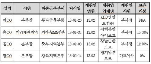 낙하산 인사는 올해도 어김없이 진행돼 올 7월까지 11명의 전 임원이 재취업에 성공했다. KDB생명보험 부사장으로 옮겨가는 등 부사장 직함을 단 경우도 세 차례나 있었고 이 가운데 2곳인 평택동방아이포트와 강남순환도로는 산은 지분이 각각 15%, 12.8%을 보유한 것으로 나타났다.