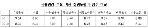 국민권익위원회(이하 권익위)가 매년 실시하는 공공기관 청렴도 평가에 따르면 기업은행의 청렴도 점수는 2010년 9.17점, 2011년 9.04점, 2012년 8.39점으로 3년째 하락했다. 이는 2010~2011년 연속 최상위권 평가와 대조적인 모습이다.