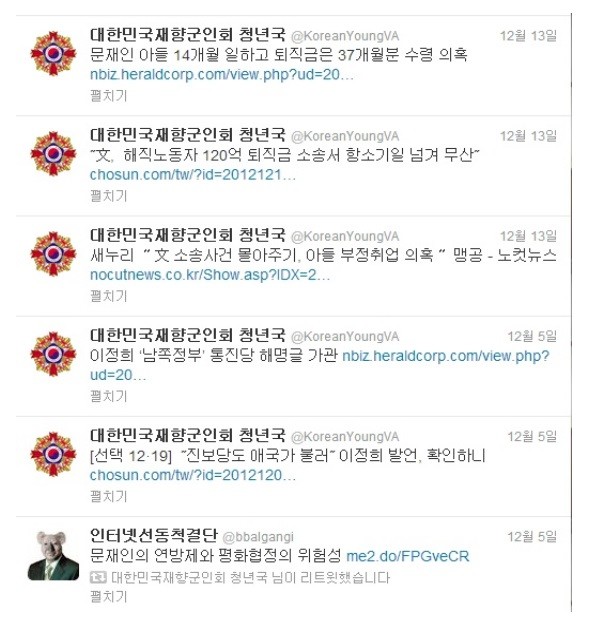 또한 이 공식 트위터에는 대선기간동안 여러 건의 문재인 후보, 이정희 후보 비난 글이 게재된 사실도 드러났다.