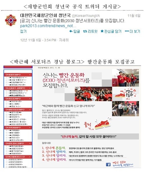 김기식 의원이 공개한 자료에 따르면 재향군인회 소속 청년국은 대선기간인 지난해 11월 6일 공식 SNS를 통해 박근혜 선대위 청년본부인 ‘빨간 운동화‘ 회원 모집 공고를 했으며, 이 날은 선대위 청년본부가 회원을 모집한 첫날이었음이 확인됐다.