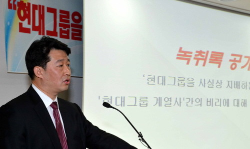 | ▲ 지난해 11월 현대증권 노동조합 민경윤 위원장이 현대그룹 계열사간 비리 2차 녹취록을 공개하고 있다.ⓒNewsis | ||