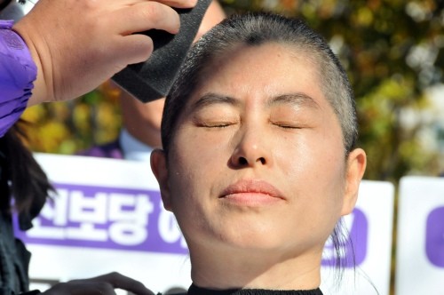 | 눈을 깜은 채 삭발하는 통진당 울산시당 강혜련 남구의원 @Newsis | ||