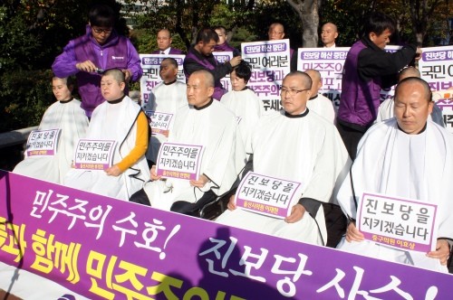 특히 통합진보당 울산시당 시의원을 비롯해 당원들은 이날 시청 남문 앞에서 민주주의 수호·진보당 사수 투쟁선포식을 갖고 비장한 각오로 삭발식을 단행했다.