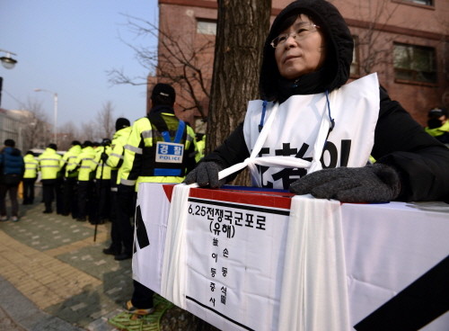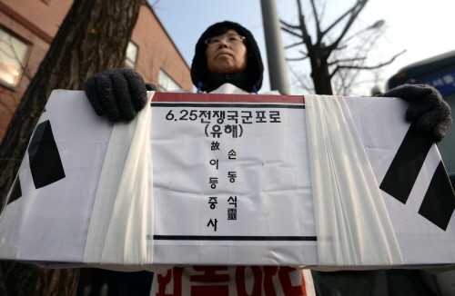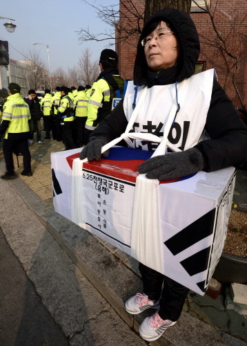 4일 국군포로 고 손동식씨의 딸 명화(51)씨가 종로구 청운동사무소 앞에서 지난 9월 북한에서 유해로 송환된 아버지 유해를 어깨에 메고 국방부를 상대로 유골송환비용과 명예회복, 사망일자 변경 등을 요구하고 있다.