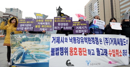 이날 동물자유연대는 ㈜거제씨월드 측이 지난 5월 돌고래 4마리를 일본에서 들여와 거제 연안 임시 사육시설에 두었다가 지난 달 30일 공사 중인 이 건물로 옮겼다고 설명하고 거제씨월드 측이 수입 신청한 물고기 19마리 중 4마리를 이날까지 임시 사육시설에 관리하도록 조건부 승인을 해준 낙동강환경유역청의 조건부 승인취소를 촉구하고, 수입된 돌고래들을 안전한 시설로 옮겨야 된다고 주장했다.