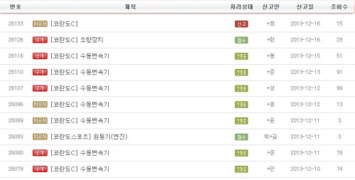 | ▲ 자동차결함신고센터에 접수된 쌍용자동차 코란도C모델의 수동변속기 결함 신고 내역 일부 | ||