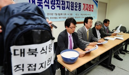 | -사진은 지난 2010년 7월 북한정의연대 등 북한인권단체들이 두만강 일대에서 북한주민들에게 식량을 직접 전달하는 '대북식량직접지원운동'을 펼치기로 하고 기자회견을 갖고 있는 모습이다. ⓒNewsis | ||