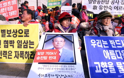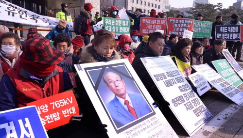 20일 서울 강남구 한국전력 서문 앞에서는 밀양송전탑 전국대책회의 관계자들이 밀양송전탑 건설반대 촉구 기자회견을 가진 뒤 故유한숙씨를 추모하는 집회를 열었다.