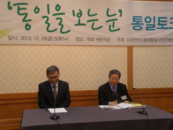 | ▲ 20일 한반도평화통일시민단체협의회 주최 ‘한반도평화통일 송년포럼: 통일을 보는 눈’에서 이종석 전 통일부 장관(왼쪽)과 이장희 상임대표(오른쪽)는 박근혜 정부의 대북정책 문제점과 출구전략을 제시했다. ⓒ일요주간 | ||