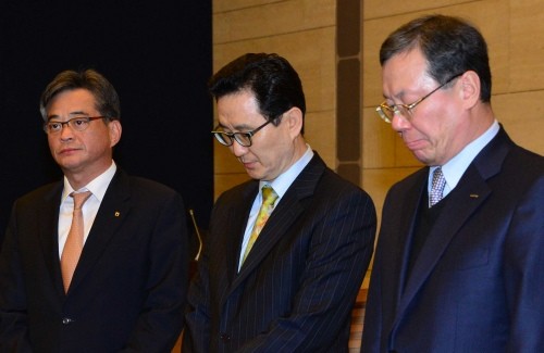 | ▲ 검찰이 카드사를 통해 1억건 이상의 고객정보가 유출된 사실을 적발한 가운데 8일 3개 카드사 대표들이 고객들에게 사과했다. 왼쪽부터 손병익 농협카드 분사장, 심재오 KB국민카드 사장, 박상훈 롯데카드 사장. ©Newsis | ||