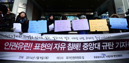 서울 중구 국가인권위원회 앞에서 9일 오전 공공운수노조 서경지부와 중앙대 청소노동자들이 참석한 가운데 ‘중앙대학교 국가인권위 진정 기자회견’을 열려 눈길을 끌었다.