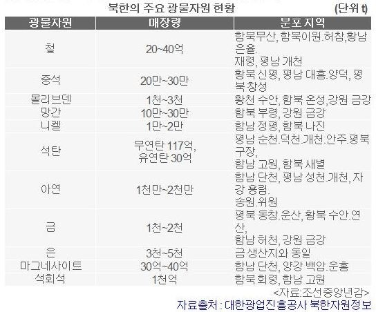 북한의 구리 매장량은 한국의 52.6배이며, 금 매장량은 한국의 50배, 석탄의 매장량은 42배, 아연의 매장량은 34.1배, 석회석은 22배나 다량 매장되어 있다. 더욱이 최근 한층 각광받고 있으며, 각종 첨단 산업에 활용되는 희귀 광물인 희토류가 2,100만 톤 정도 매장돼 있는 것으로 추산된다.