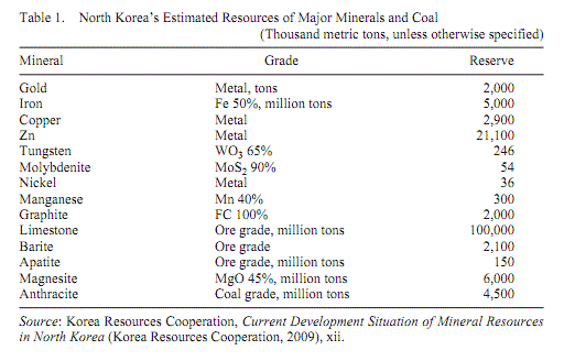 이렇듯, 한국과 북한의 지하자원 매장량과 잠재가치를 비교하면, 북한의 금·아연·철 등 금속류 매장량 잠재가치는 약 416조 5,000억 원으로 우리나라 6조 3,000억 원의 66배에 해당하며, 흑연·석회석·인회석(燐灰石) 등 비금속류의 경우, 북한은 약 3,900조 원으로 우리나라 154조 3,000억 원의 25배에 이른다.