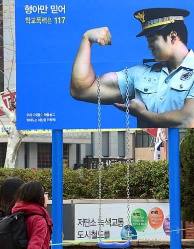 2일 오후 부산경찰청과 이제석 광고연구소는 학교폭력을 방지하기 위해 '경찰 형아·누나만 믿어'라는 이색광고판을 해운대, 부산역 등곳에 설치했다.