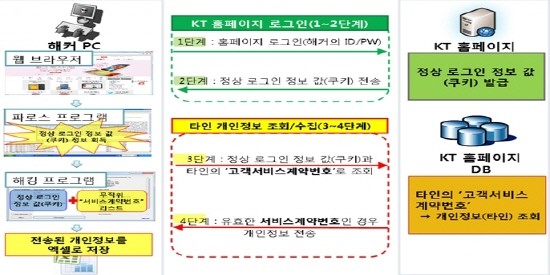 특히 이번 해킹은 통상 개인정보(DB) 조회 시 '고객서비스계약번호'에 의해 본인 여부를 검증하는 단계가 있으나 KT의 홈페이지는 이 절차가 없는 취약점을 악용해 이뤄졌다.