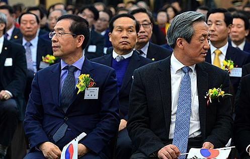 | ▲ 6·4 지방선거 서울시장 출마를 선언한 새누리당 정몽준(오른쪽) 의원과 박원순 서울시장이 7일 용산구 국방컨벤션에서 열린 '2014년 서울시재향군인회 55차 정기총회'에 참가했다. ⓒNewsis | ||