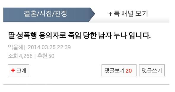 25일 포털사이트 네이트판에 살해당한 남학생의 친누나 지인이라고 자신을 밝힌 A씨가 ‘딸이 성폭행 당했다고 죽임을 당한 남자의 누나입니다’라는 제목으로 글을 남겼다.