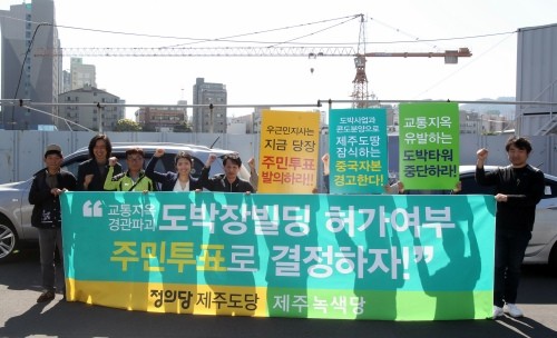 정의당 제주특별자치도당과 제주녹색당은 7일 오전 기자회견을 열고 경관파괴용 초대형도박장 개설로 인해 교통대란을 유발하고 주민의 일상적인 안전한 삶까지 위협하게 될 것이라며 드림타워 허가 여부에 대한 주민투표 발의에 돌입하겠다고 밝혔다. 이들은 우근민 지사가 이를 거부할 경우 청원운동까지 불사하겠다는 강경한 입장이다.
