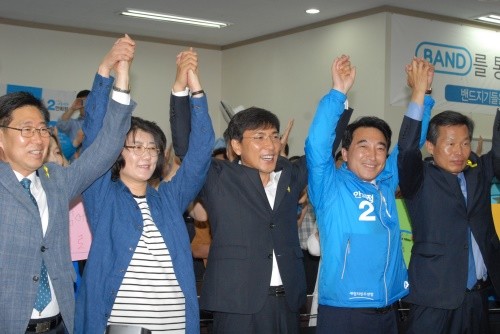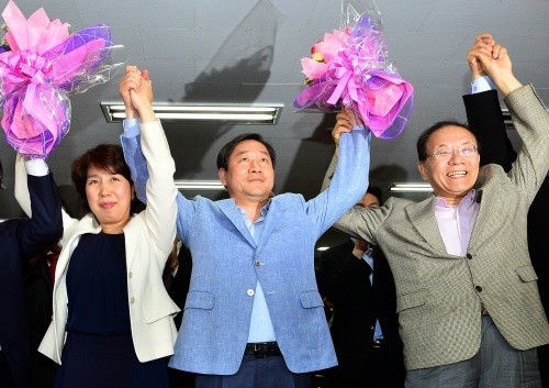| 6·4 전국동시 지방선거 당선이 유력시 된 새누리당 유정복(가운데) 인천시장 후보가 5일 오전 인천 부평구 경원대로 캠프 상황실에서 부인 최은영(왼쪽) 씨와 황우여 공동선대위원장의 손을 잡고 환호하고 있다. | ||