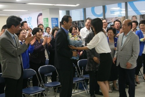 | ▲6·4 전국동시지방선거 개표가 시작된지 12시간만인 5일 오전 6시 강원 춘천시 온의동 최문순 새정치민주연합 도지사 후보 선거사무실에서 재선에 성공한 최문순 도지사에게 딸이 꽃다발을 선물하고 있다. ⓒNewsis | ||
