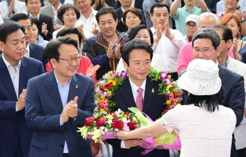| 5일 오전 제6회 전국동시지방선거에서 당선된 새누리당 남경필 경기도지사 당선인이 지지자들에게 축하 꽃다발을 받고 있다. | ||