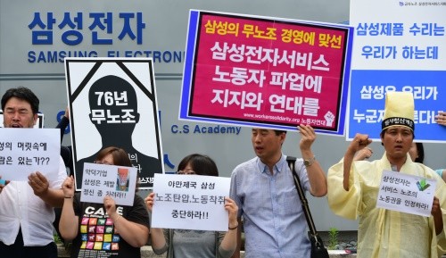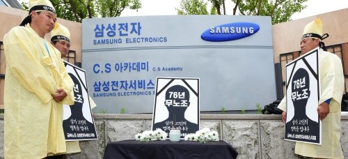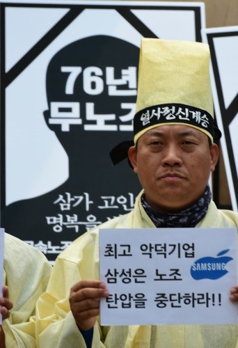 이들은 17일 오후 경기 수원 삼성서비스 본사 앞에서 41일 동안 삼성전자 정문 앞에서 노숙투쟁을 벌이는 삼성서비스 노동자들이 지켜보는 가운데 ‘76년 무노조’ 장례식 퍼포먼스를 진행했다.
