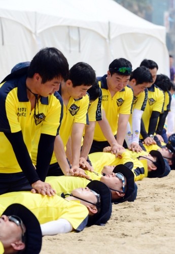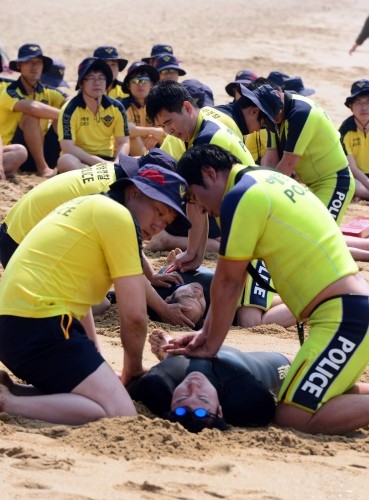 25일 부산 광안리해수욕장에서는 해경 안전관리요원들이 심폐소생술 등의 훈련을 통해 응급 시 신속한 구조에 대비했다.
