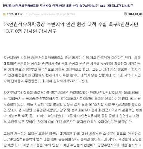 한편 지난 4월 7일 평화와참여로가는인천연대 등 지역 시민단체들은 ‘SK인천석유화학공장 주변지역 안전 및 환경 대책 수립 촉구하며 인천시민 1만 3,710명의 서명을 모아 감사원에 감사청구를 한 바 있다.