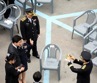 이날 영결식에 참석한 새누리당 김태호(경남 김해시을) 최고위원은 순직 소방관들의 영결식이 끝나고 운구차량이 춘천안식원 화장장으로 떠나는 사이 의용소방대원으로 보이는 여성과 함께 환한 미소를 지으며 기념사진을 찍었다.