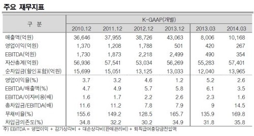 한싱평은 “계열영업 호조, 플랜트부문 강화 및 SOC사업 참여 등에 따라 주택사업 위축을 보완해 4조 원 내외의 외형을 유지하고 있으며, 안정적인 영업영위에 필요한 공사물량(2014년 3월 말 기준 수주잔고: 20.4조 원)도 확보하고 있다”고 분석하면서도 “앞으로도 부동산경기 침체가 지속될 경우 개발사업에서 추가적인 부실이 발생할 가능성도 배제할 수 없는 상황이다”고 내다봤다.