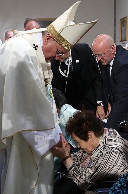 프란치스코 교황은 미사에 앞서 오전 9시 명동성당 문화관 1층 중앙홀에서 이웃 종교 지도자 12명과 위안부 피해자 할머니들을 만났다. 특히 미사의 앞줄에는 김군자, 강일출, 이용수 할머니 등 일본군 위안부 피해자들이 앉았다.