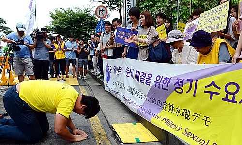 이날 위안부 할머니들을 비롯한 각계 각층의 참석자들은 주한일본대사관을 향해 '진상규명', '일본 공식 사죄' 등을 요구하는 글이 적힌 피켓을 흔들며 '위안부' 문제의 조속한 해결을 촉구했다.