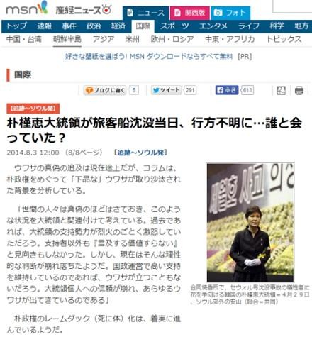 가토 지국장은 지난 8월3일 ‘박근혜 대통령 여객선 침몰 당일 행방불명, 누구와 만났을까?’ 라는 제목의 기사에서 세월호 참사 당일 박 대통령의 행적이 7시간여가량 파악되지 않은 점을 지적하며 증권가 관계자의 말은 인용한 루머를 보도한 바 있다.
