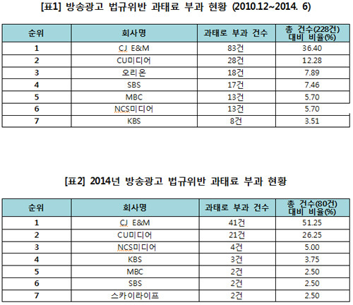 특히 올 2014년에는 총 80건의 과태료 부과 중 CJ E&M이 절반이 넘는 41건을 차지해 법규 위반이 반복·상습화되고 있음을 뒷받침 했다.