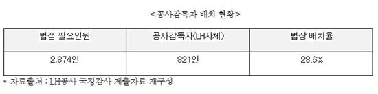 또한 LH는 자체 공사감독자 부족인원을 메우기 위해 821명의 공사감독자 중 497명을 2개 현장 이상을 겸임 감독하도록 지시했다.