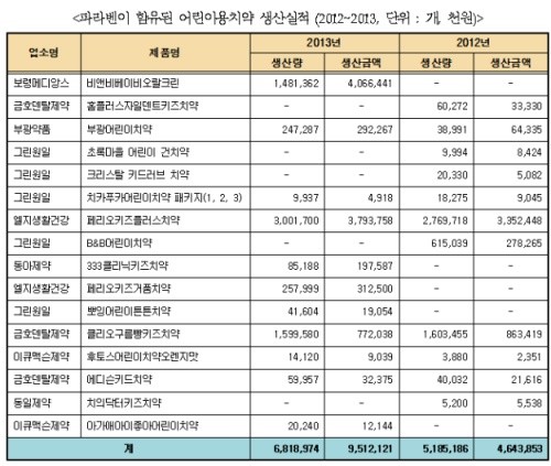 이들 제품 중 최근 2년간(2012~2013) 생산된 제품은 ‘비앤비베이비오랄크린(보령메디앙스)’, ‘페리오키즈플러스치약(엘지생활건강)’, ‘클리오구름빵키즈치약(금호덴탈제약)’, ‘페리오키즈거품치약(엘지생활건강)’, ‘부광어린이치약(부광약품)’ 등 총 1,200만 4,160개 141억5,597만 원에 달하는 것으로 확인됐다. 특히 생산량 기준으로 볼 때 엘지생활건강의 두 제품이 차지하는 비중이 가장 높았다.