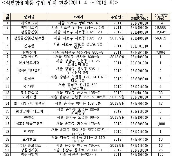 특히 2011년 4월부터 2013년 9월까지 석면을 수입한 업체 중에는 대기업인 삼성물산(석면 시멘트 제품 2회 수입, 69t), 현대중공업(석면 섬유 제품 2회 수입, 2t), 두산건설(석면 시멘트 제품 22kg), 볼보코리아건설기계(자동차용 마찰재 2회 수입, 100kg), 삼성테크윈(석면 섬유 제품 71kg), GS칼텍스(석면 섬유 제품 5kg) 등이 포함됐다.