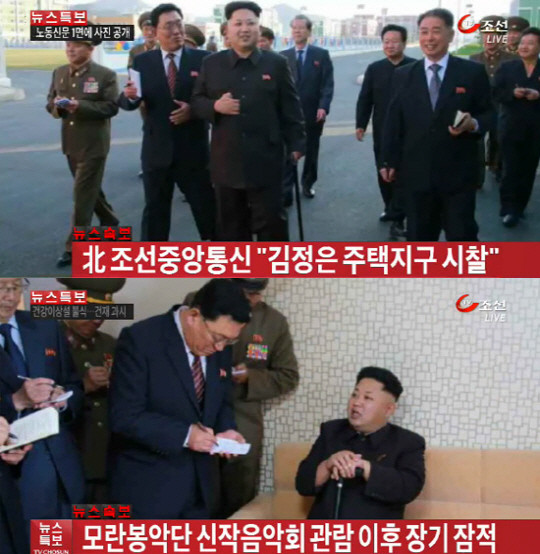 북한 노동당 기관지 노동신문은 이날 김정은의 위성과학자주택지구 현지지도 소식을 보도하면서 지팡이를 짚고 주택지구 단지를 둘러보고 있는 김정은 사진을 함께 게재했다.