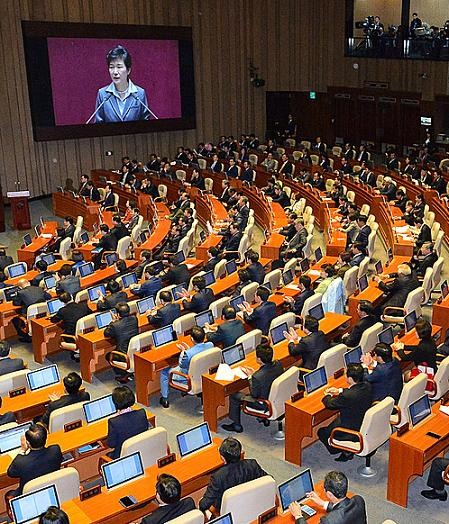 여야 의원들의 기립박수 속에 연설대에 오른 박 대통령은 단호한 어조로 경제살리기를 위한 공무원 연금개혁을 비롯한 예산안 처리 등에 국회가 협조해줄 것을 강하게 당부했다.