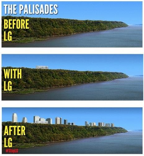 환경단체는 LG전자의 신사옥이 계획대로 완공될 경우 1개 층이 숲 위로 튀어나와 천혜의 팰리세이즈 절벽 풍치를 망가뜨리게 된다고 주장했다. 2억년전 탄생한 팰리세이즈 절벽은 1억8300만년 생성된 그랜드캐년과 록키산맥보다 오래된 미국의 ‘국가적 보물’이라는 것.