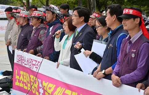 노조는 “조합원 일감 뺏기를 자행해 온 사측과 경총은 120만원 기본급을 골자로 한 임금 개악안까지 들고나왔다”며 “이대로는 교섭을 진행하기 어려운 수준으로 판단 돼 지난 10일 교섭을 중단했다”고 말했다.